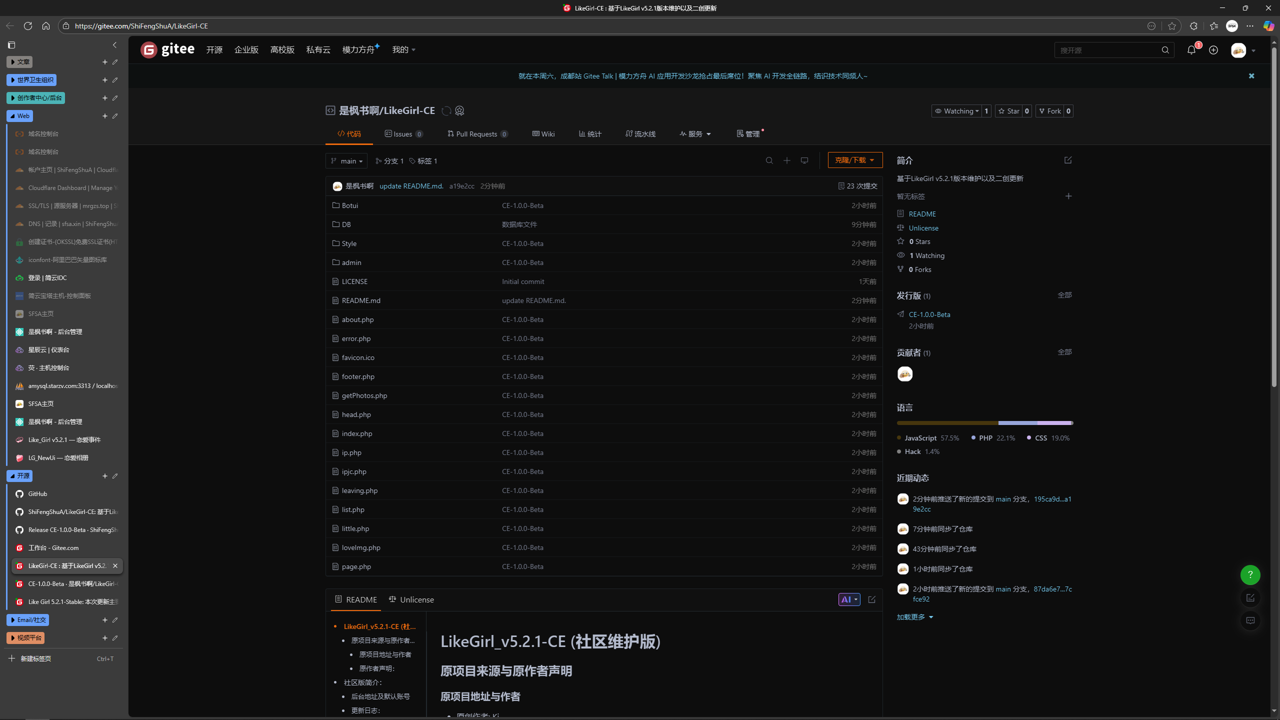 1.修改了一些细节,功能无更新 ————2.新增Docker镜像,拉取代码docker push shifengshua/likegirl-ce:1.0.3(Docker镜像仅包含 网站源码 / PHP / PHP常用扩展,Nginx / MySQL / phpMyAdmin 请自行安装容...