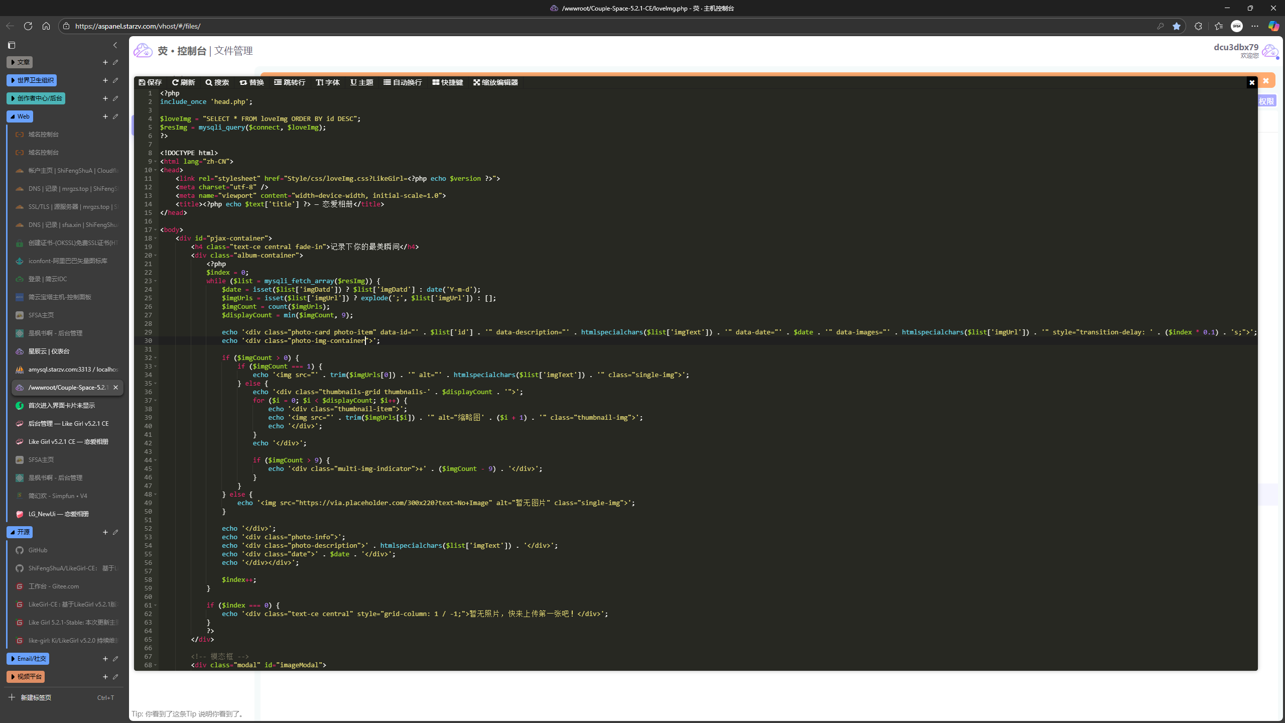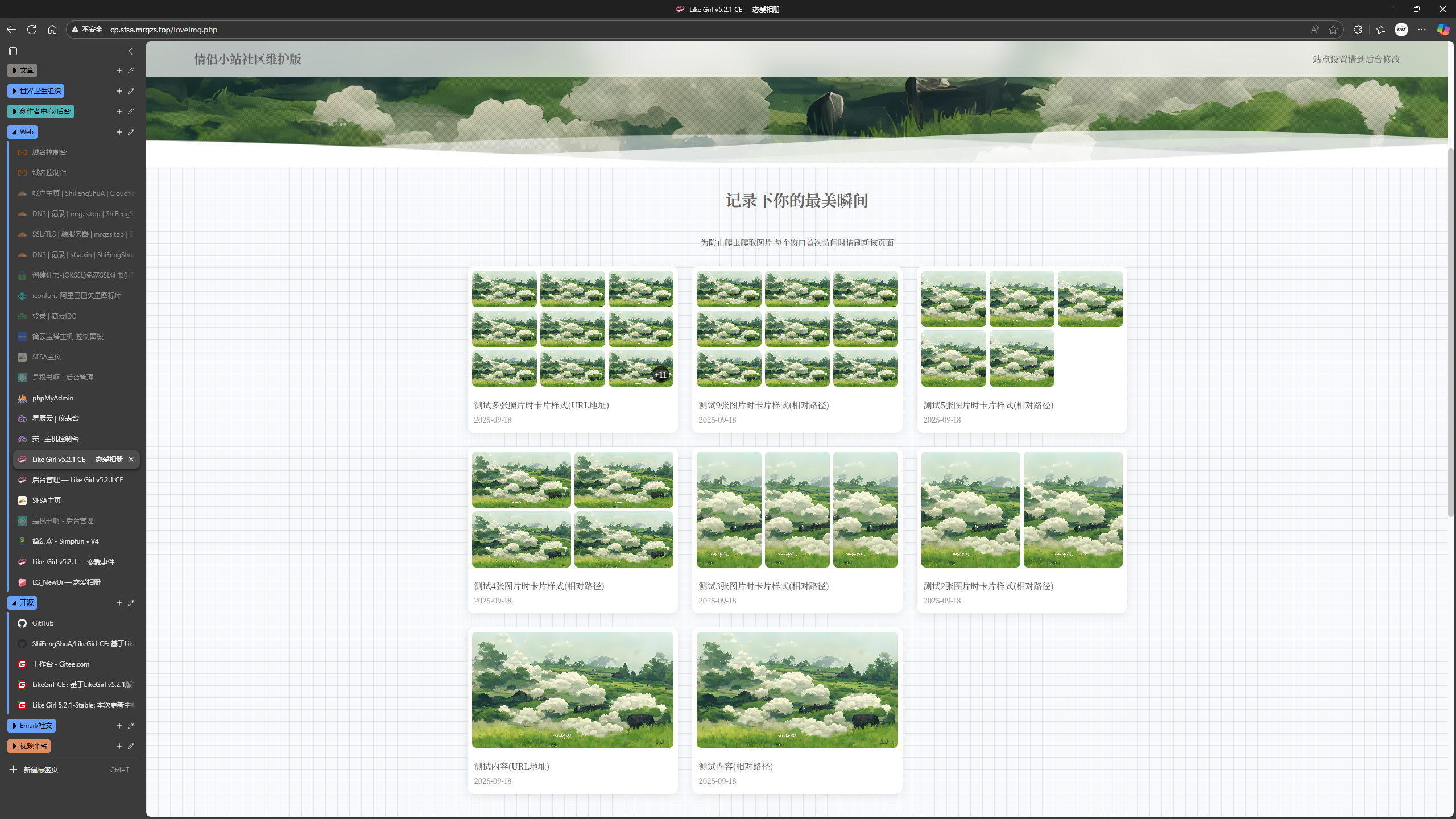 与官方版对比,社区版在“恋爱相册”页面做了改动,单个卡片可容纳多张照片,缩略图最多显示9个,多余的图片数量显示在卡片右下角,后台新增相册处也同步做了改动。